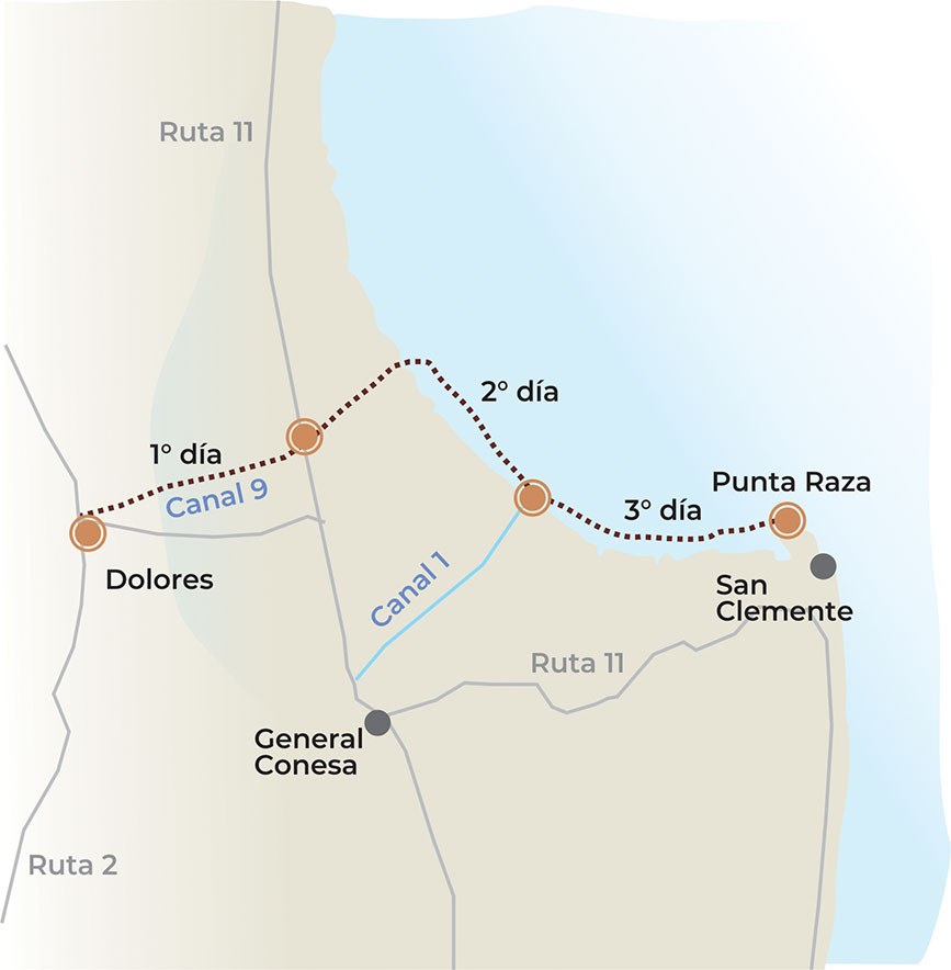 El recorrido es tan extenso como desafiante: aproximadamente 100 kilómetros, uniendo Dolores con San Clemente del Tuyú, atravesando los distritos de Tordillo y General Lavalle, hasta abrirse paso hacia uno de los escenarios más imponentes y temidos del Río de la Plata: la Bahía de Samborombón.